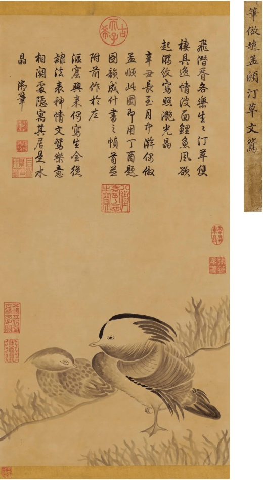 1781年,71岁的乾隆帝再次临摹赵孟頫的《汀草文鸳图》,他接旧纸成原作尺幅,还新作一首诗,并录旧诗,同韵自和,录于画上。
