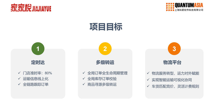 家家悦集团董事长王培桓指出,供应链是连锁经营的核心,效率是未来发展的关键,此次家家悦集团携手上海科箭公司启动“定时达”项目,是家家悦推进供应链数字化升级又一重要项目,通过整合订单、运输、仓储及运力资源,提高到店准时率,使门店为消费者提供更加新鲜优质、物美价廉的产品,为顾客的美好生活助力。