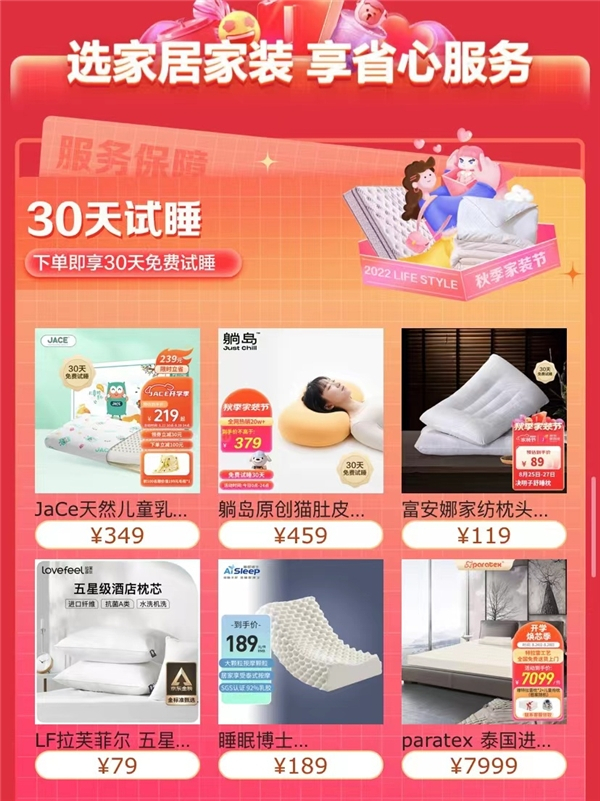 与此同时,家纺、枕头等用品,提供30天试用/试睡服务;家居日用商品180天出现质量问题,只退款不退货;窗帘品类提供免费测量、免费设计、免费安装的三包,省钱又省心;厨具奉上180天粘锅包退服务,以及磨刀、开锅增值服务;建材安装提供免费配送、免费安装、免费拆旧、免远程费/免二次上门、免打孔费等“五免”服务。这些升级特色服务,让线上购买家居家装商品更加放心,售后更有保障,为消费者带来了极致的购物体验。