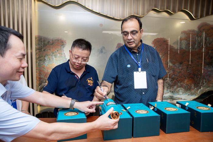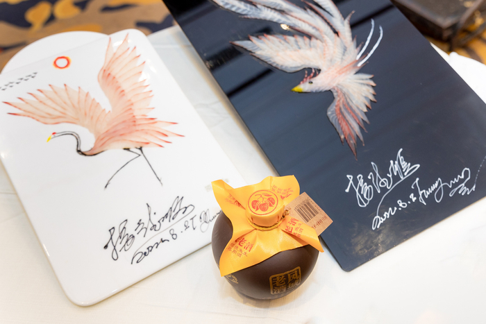 参观结束后,夏泽翰教授在被誉为“顺德茅台”的经典酱香凤城液签名留念。陈亮总经理亦对夏泽翰教授一行人的到来再次表达了欢迎,并在经典酱香凤城液签名,将其赠与给夏教授,同时为来宾们准备了鱼生专用酒——凤城老酒作为伴手礼。