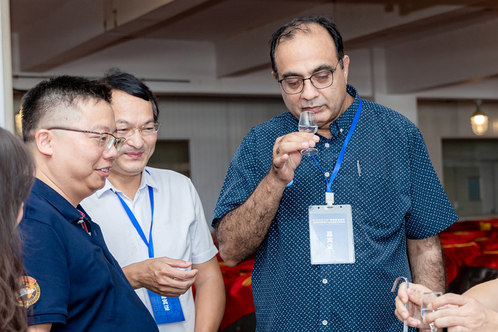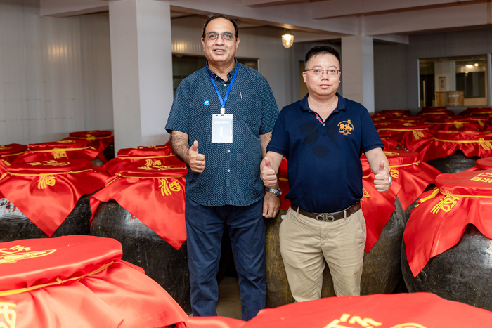 在陈藏间,工作人员还打开了装有1000斤红荔红米酒的陈酿陶缸供来宾品尝,夏泽翰教授品尝后不禁竖起拇指大赞“very good”!