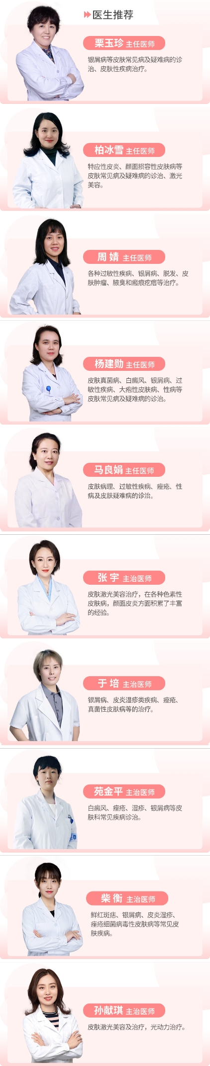1、银屑病 银屑病是一种慢性、炎症性疾病,尤其在东北地区的发病率远高于国内其他地区。哈尔滨医科大学附属第二医院皮肤科积极引进各种先进的治疗手段,并形成自己的特色诊疗,始终坚持患者个体化的“一条龙”式治疗,包括传统药物治疗、中药药浴及淀粉浴治疗、紫外光疗、生物制剂治疗等,在省内率先广泛推广,治愈诸多患者,得到一致好评。哈医大二院皮肤科主任栗玉珍教授致力于银屑病发病机制及相关影响因素的研究已有20余年,先后多次参加《银屑病诊疗专家共识》、《生物制剂治疗银屑病专家共识》等业内指南的制定,带领课题组获批国家自然科学基金项目5项,发表SCI收录文章50余篇,《银屑病发病机制及相关因素研究》荣获黑龙江省科技进步二等奖。成功从来都不是一蹴而就、空穴来风,只有历经寒霜才会迎来春天的百花齐放。经过多年经验的积累和总结,该科室的银屑病治疗一直处于国内领先水平,并于2017年荣获全国银屑病专病示范门诊、2020年荣获全国银屑病专病优秀示范门诊、2021年荣获银屑病规范化诊疗中心示范中心。