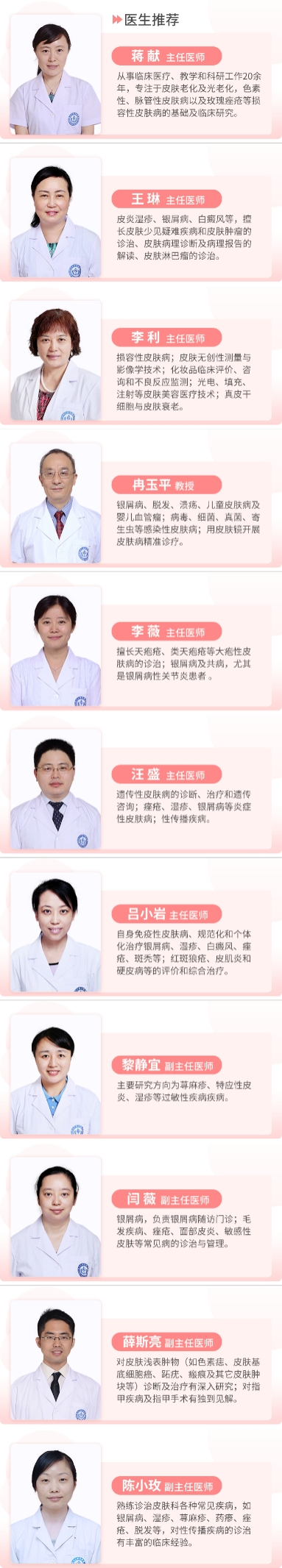 两汉刘邦渴求猛士兮守四方,清代龚自珍感叹道“我劝天公重抖擞,不拘一格降人才”。科室现有医师45名,其中名老专家4人,教授8人,副教授8人,多人在中华医学会皮肤科分会及中国医师协会皮肤性病学分会担任副主委、常委、委员、学组组长等重要职务。每年为国家培养博士、硕士近20名。所谓“千金何足惜,一士固难求”,四川大学华西医院皮肤科招收进修医师20人左右,科室现有博导6名,硕导11名。各科室设置了10个亚专业方向:医学美容与化妆品学、损容性皮肤病、变态反应及炎症性皮肤病、银屑病、自身免疫性皮肤病、真菌及感染性皮肤病、性传播疾病、皮肤肿瘤临床病理研究、遗传性及儿童皮肤病、皮肤外科及毛发疾病;除此之外还设有多个以疾病为中心的专业组,如甲病组、毛发疾病组、罕见病组等。经过多年的教学实践积累,培养了一批具有丰富临床经验的指导教师。在现任科室主任蒋献教授,副主任王琳教授,支部书记黎静宜副教授的组织带领下,以及护士长陈吉辉,副护士长任丽的共同努力下,团结全科室职工,组建了一支高素质、硬技术,全心全意为患者服务的人才队伍,医疗技术实力雄厚、临床经验丰富,尤其对疑难重症病例的诊治更具有独特之处。