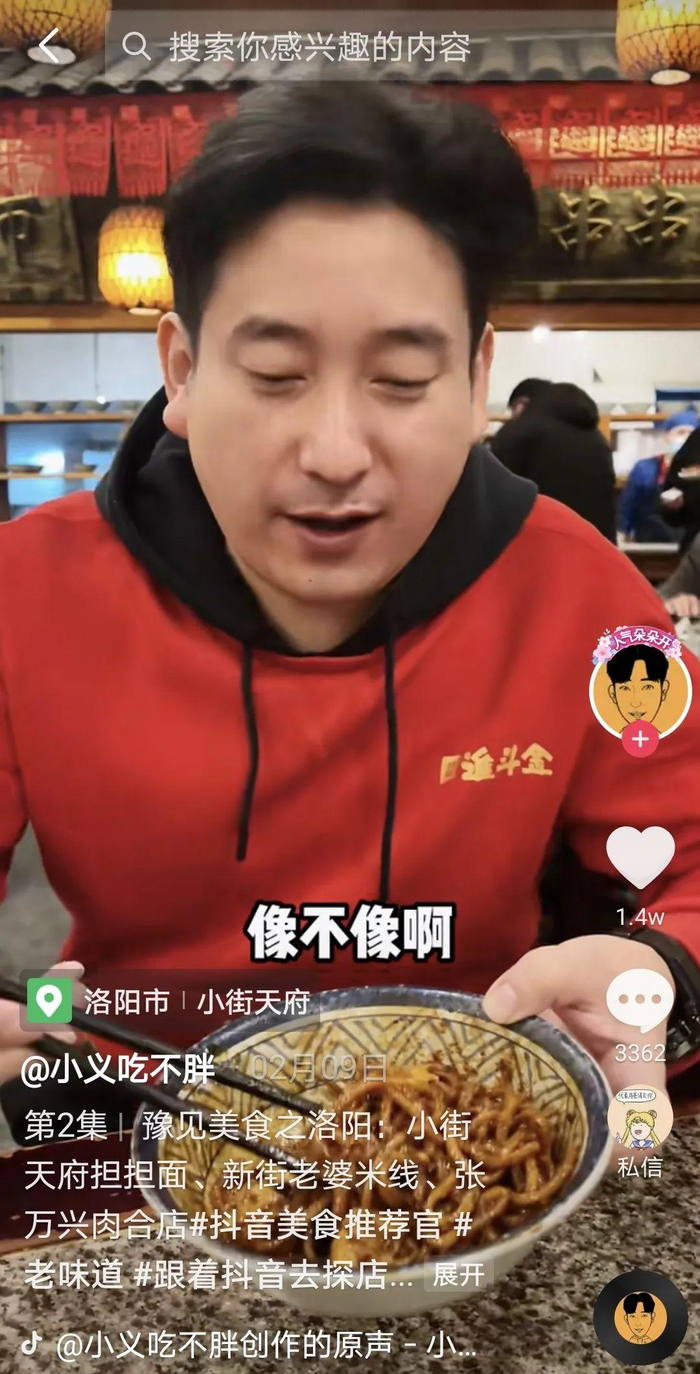 对如今的郑州红人小义来说,拍本地探店短视频,始于他个人对于美食的热爱。“我是那种愿意开两个小时车去找美食的人,哪怕家门口就有别的店。去广州出差,我都愿意拐去顺德,就为了吃好吃的。”
