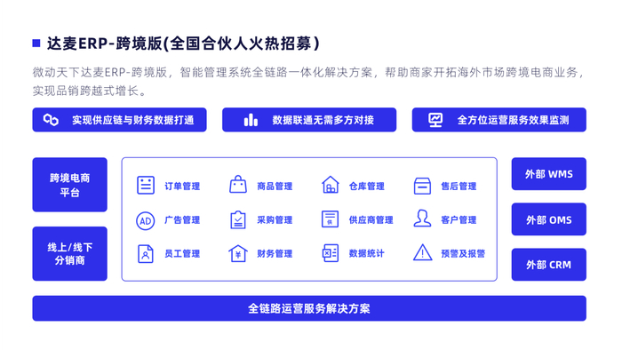 目前,我们针对跨境电商推出的TikTok版ERP系统启动全国城市代理合作伙伴招募计划,邀您共享万亿级市场红利,携手掘金万亿赛道。如想了解更多产品详情/代理商申请,可关注“微动天下官微”微信公众号进行咨询。