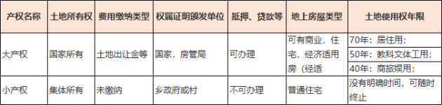 太平洋房屋知识分享: 按房屋产权分类,可分为大产权和小产权。大产权房拥有国家颁发的产权证,而小产权房不发产权证,且无法进行银行贷款和抵押贷款等。