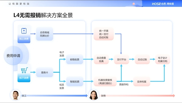 回过头看一下L4级“无需报销”解决方案的全景,从员工提交申请开始,无论是线上采购还是线下采购,无论是电子发票还是纸质发票,到财务的对账、复核、支付、记账、归档等等全流程、全场景都覆盖。并且,这个过程中,员工无需垫资、无需开票、无需报销,财务工作也因有了一系列自动化工具得到极大简化。这也是为什么我们说,合思·易快报是业内领先的全链路L4级无需报销解决方案。