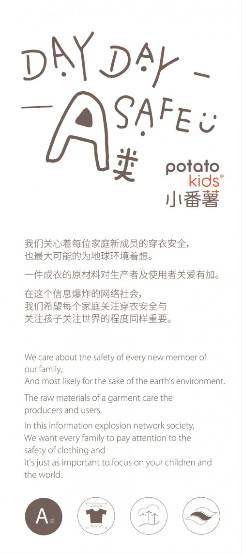 potatokids小番薯关心着每位家庭新成员的穿衣安全,也最大可能的为地球环境着想。品牌成立于2010年,专注于0-12岁儿童家居服饰设计、生产及销售十余年。