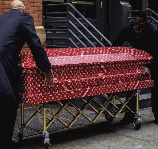 如果你觉得钢丝球有点看不懂,那接下来这一幕会令你目瞪口呆——LV和Supreme联名推出棺材,此举效果明显,相关新闻迅速霸占国外社交媒体热搜榜单。