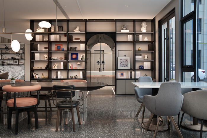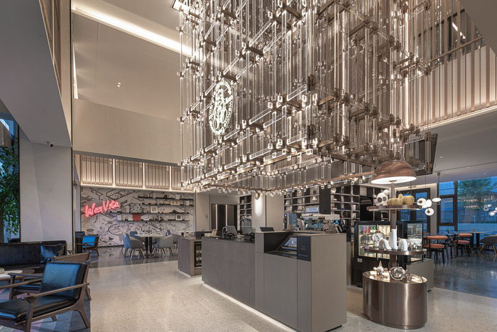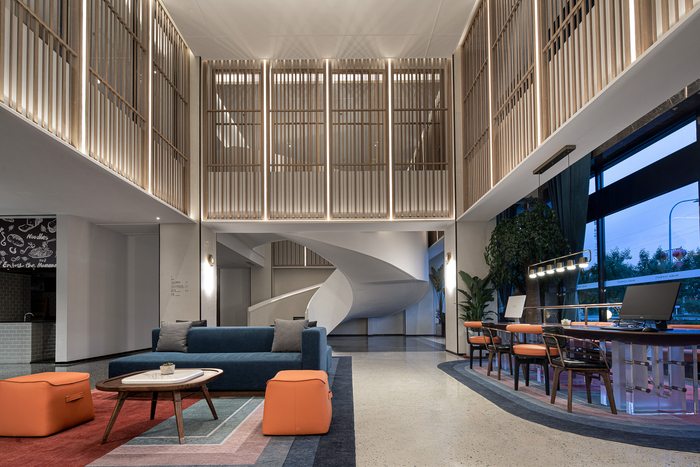 北京平谷万达美华酒店的设计特色之一是前台“消失了”。万达酒店设计研究院的设计师将万咖啡(WanVita-Cafe&Lounge)综合服务台和巨型亚克力吊架构成整个空间的视觉中心,四周的书架和木栅与之相呼应,营造端庄内敛的序列感;整体暖灰色的色调,令人内心恢复平静。