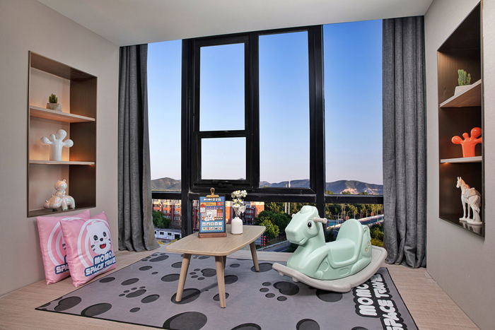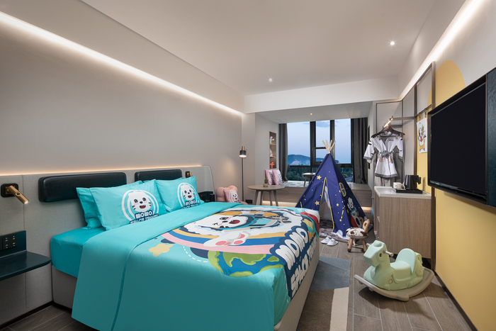 momo原是《山海经》中的开明兽,负责镇守天庭;而在momo亲子客房里,momo化身为航天员,陪伴小小客人们探索和发现宇宙奥妙。从办理入住的momo房卡,到客房里momo定制床品,拖鞋和睡衣,令人爱不释手;星空帐篷、摇摇马和momo毛绒玩具,让人沉浸在童趣世界里;还有儿童洗护用品、专用坐便器和洗漱小板凳等,让父母们倍加舒心。
