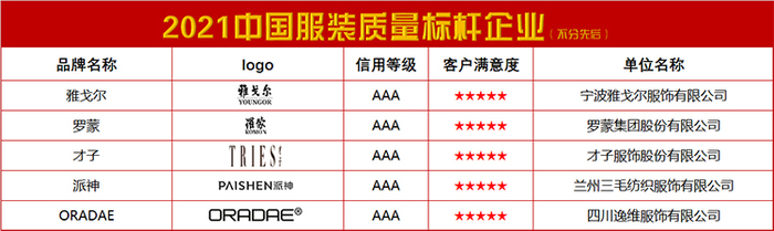近期,招投标供应链品牌推介平台举办了以“绿色创新——定义品牌新生态”为主题的“2021中国服装招标采购评价推介活动”。据了解,招投标供应链品牌推介平台作为全国招投标领域领先的品牌推介服务平台,旨在通过此专题活动聚焦我国服装行业发展特点、需求以及趋势,助力服装品牌企业以“品牌”、“质量”为核心,把握新形势、抓住新机遇、打造新优势。遴选出在品质、设计、营销、服务等各领域不断突破创新,为广大客户带来差异化优质体验,并深度赋能助力整个产业链高质量发展并起到行业带头作用的企业,打造服装行业质量新标杆,为广大采购单位和社会各界提供参考,进而加速服装行业品质化、绿色化、数字化进程,以开放和共享的姿态提升服装品牌张力,塑造生态新价值。“2021中国服装质量标杆企业”名单具体如下:
