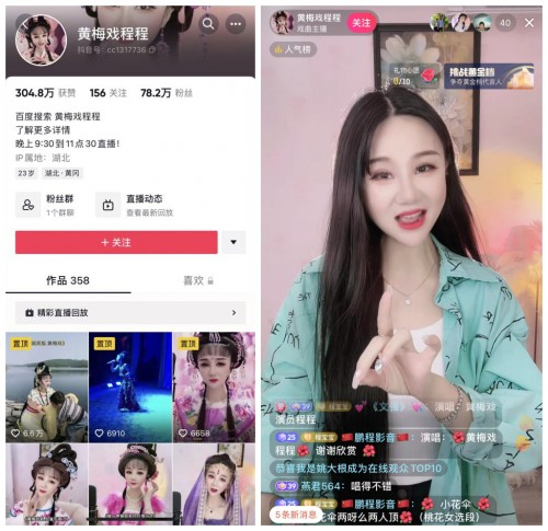 开始直播后,程程发现,相比传统的黄梅戏演员的成长路径,她似乎有了另一种选择:成为一名戏曲主播。“在抖音上唱戏,可以让更多人了解黄梅戏,了解传统文化”。