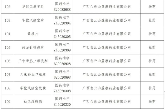 8 月 17 日,从广西壮族自治区中医药管理局官网发布的“自治区中医药局关于公布广西民族药名单(首批)的通知”获悉,白云山盈康以特色民族壮(瑶)药材组方精制而成的三味清热止痒洗剂、九味补血口服液、华佗风痛宝片(薄膜衣)、华佗风痛宝片(糖衣)、华佗风痛宝胶囊、黄根片、两面针镇痛片、祛风湿药酒等 8 个壮成药获认定为广西民族药。此次广西首 次开展民族成药认定工作,是广西民族药发展史上的一个重要里程碑,将为广西民族医药的传承创新发展注入新动能,让壮药展翅高飞的翅膀更加强劲有力。