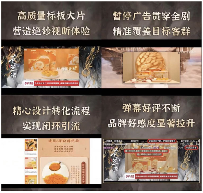 伴随内容口碑的逆袭,《苍兰诀》与诸多品牌达成多元合作。首次在长视频领域投放的轩妈蛋黄酥,蓄力中秋热卖季,除片头口播标板、暂停广告的形式外,还展开IP授权联名营销。同时爱奇艺精心设计了跳转、购买落地页,缩短看剧-种草-拔草的决策路径,网友直呼“哪款好吃,本座去买”, 帮助提升转化效率,实现破圈传播。