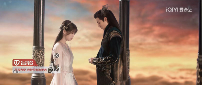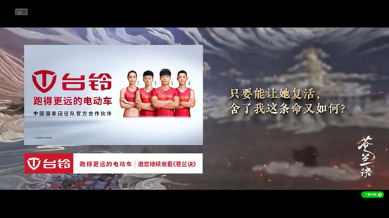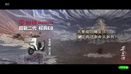 《苍兰诀》所展现出的圈层效应与优质长尾价值,也吸引了如未可V-GIRL、佳贝艾特、伊利、三星等长期合作品牌追加投放。品牌不仅依托于信任感和默契度,更是看中爱奇艺的合作落地效率,当黑马项目初现时便能及时捕捉并细化落地方案,让品牌抓住每一个爆款内容机遇。在口播标板、创可贴等内容营销形式外,今年的广告创新产品“金句贴”也再次受到品牌青睐。它将内容的精华梗与品牌商业价值融合,发挥“价值观感染营销”的效能。例如,台铃电动车选择了创可贴+金句贴+暂停三种广告形式,相比单点投放形式,组合策略能够以多频次、多场景触达用户,有效提升品牌的认知度和购买意愿。
