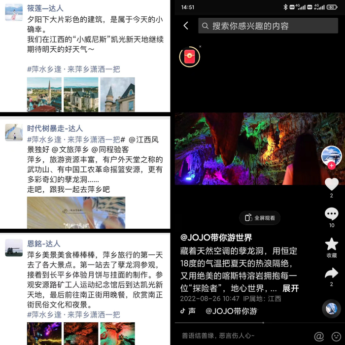 8月24日-28日,由萍乡市文化广电新闻出版旅游局主办的“萍水乡逢潇洒萍乡行,来萍乡潇洒一把”验客达人活动圆满收官。总粉丝达千万的9位验客大咖,通过四天三晚的深入旅游体验,打造了一大批优质原创摄影作品、短视频、游记攻略,全方位多角度地展现“萍水乡逢潇洒萍乡行,来萍乡潇洒一把”的无穷魅力和文化内涵。沉浸式体验萍乡的自然风光、历史人文、特色美食、民俗风情,深度感受、探寻、发现其独特的魅力。