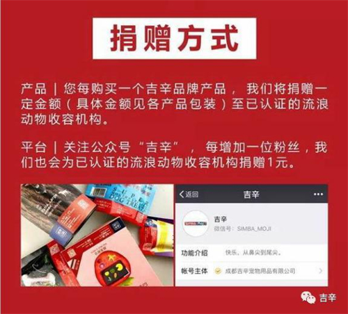 此外,吉辛微信公众号每增加一位粉丝,也会向已认证的流浪动物收容机构捐赠一元钱,以实际行动呼吁公众关爱流浪动物,让更多的小动物得到救助。“领养代替购买”,传播正确养宠观念,为流浪宠物机构提供帮助,是吉辛的社会贡献与责任担当。
