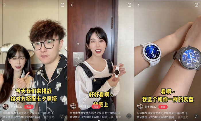 活动期间恰逢七夕节点,更有情侣博主@冬冬和37 从节日礼品、七夕穿搭等角度切入,展示了华为Watch GT3 Pro作为实用精致好礼、情侣表穿搭的消费场景,种草心智也在多元的内容下完成了植入,打造出完整的内容链路闭环。