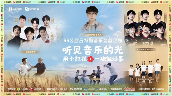生活中有这样一群人,他们勇敢生活,即便身处逆境,依然秉持热爱、努力奔赴未来。这些在平凡中高歌的人既是生活的歌颂者,亦被生活歌颂着。今年99公益日,QQ音乐及全民K歌、QQ浏览器、腾讯SSV,联合首席媒体合作伙伴中国新闻网共同打造特别公益企划——“听见音乐的光”,邀请EDG战队(EDG合创汽车英雄联盟分部)、毛不易、“0713再就业男团”全员(陈楚生、陆虎、王栎鑫、王铮亮、张远、苏醒)成为“公益筑梦官”,分别携手上海听障康复治疗儿童演绎《孤勇者》、助力凉山的大山师生合唱《无问》、共筑河北乡村孤寡老人《时间都去哪儿了》音乐梦,让这些平凡而勇敢的人们唱出他们心声的同时,凝聚关爱,带着音乐的光,去照亮更多人的梦想。9月1日-9月9日期间,用户每天来QQ音乐观看上述公益企划的MV、收听公益歌单,从而免费领取99公益“小红花”,并可捐赠给“300名听障孩子的音乐康复课”、“给1000名乡村学生上职业启蒙课”、“情暖万名孤寡老人”三大公益项目,届时腾讯基金会将根据小红花筹集情况启动实施相应公益项目,让我们用小红花一块听好歌,一块做好事。