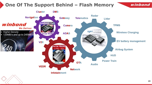 具体来看,华邦Serial NOR Flash一直以来占据着车用大多市场应用。而随着数字化提升,需要存储的代码体积也越来越大。面对即时通信以及快速上传、下载的需求,华邦电子也推出了8 I/O接口的OctalNAND Flash。通过8 I/O,每秒的最高传输速度可达240MB,可应用于高速传输以及低时间延迟的应用上,并且Octal NOR Flash也将在不久的将来加入这个竞争市场。