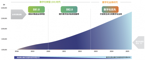 随着数字化进程的不断深入,企业数字化转型逐步从1.0时代跨入2.0时代,即从加速和扩大数字化技术的应用和对业务的支持,到关注数字化转型带来的切实经济价值和收益,提升投资回报率。可以预见的是,企业数字化转型的下一个阶段是迈入数字化业务时代。