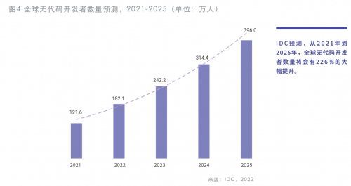 凭借无代码开发操作简单、易搭建、易用性高等特质,相关开发人员数量持续攀升。IDC预测,从2021年到2025年,全球无代码开发者数量将会有226%的大幅提升。