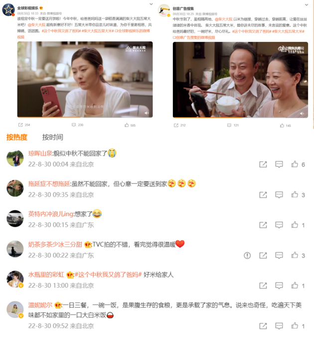 柴火大院官方微博发布的中秋温情短片《最好的米,给最爱的你》,引起了广泛的人群共鸣,并引发了不少用户的真情实感评论,更被众多微博大咖共情转载收录。不少用户表示,中秋不管能不能回家,心意一定要送到家。