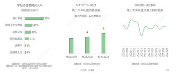 有据数据显示,随着年轻一代经济独立后逐渐影显家庭责任意识,除家庭购买自用外,约四成为孩子购买,三成为父母购买,礼盒和定制大米产品近三年消费规模走高,尤其是传统节日大促期间,消费者主动囤购大米以备送礼之需。