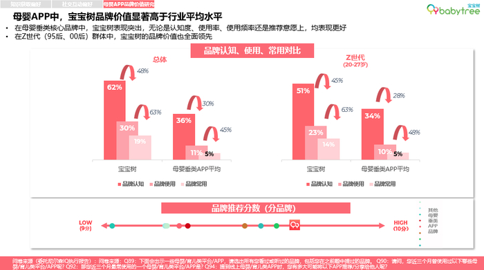 生于移动互联网时代的宝爸宝妈对网络社交有强依赖性,乐于分享、乐意被种草。报告调研显示,宝爸宝妈热衷在母婴/育儿APP网站(41%)、朋友圈(39%)上分享交流育儿知识与经验,婴儿喂养/辅食、早教/培训、育儿故事、宝宝健康管理等是母婴APP社区中主要互动话题。在母婴用户触达,渗透及推荐意愿维度上,宝宝树均高于品类平均水平,其在内容合理、全面、实用性以及核心品类种草价值上均表现出显著优势。在母婴垂类核心品牌中,宝宝树表现突出,无论是认知度、使用率、使用频率还是推荐意愿上均表现更好,在Z世代(95后、00后)群体中,宝宝树的品牌价值也全面领先。