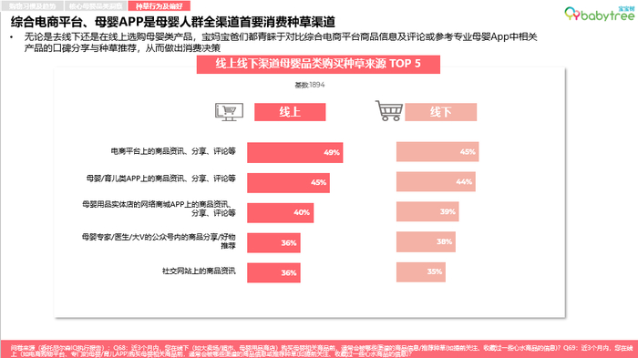 报告还显示,当代宝爸宝妈对母婴品类的种草有着更专业、更深度和更谨慎的消费心理。据调研,无论是去线下还是在线上选购母婴类产品,宝妈宝爸们都青睐于对比综合电商平台商品信息及评论或参考专业母婴App中相关产品的口碑分享与种草推荐,从而做出消费决策。