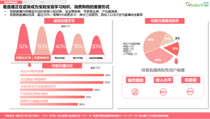 此外,看直播正在逐渐成为宝妈宝爸学习知识、消费购物的重要形式,其中最受欢迎的有育儿知识类、宝宝喂养类、专家医生类、产后瘦身类等内容。母婴类直播粘性高,超过50%的宝妈宝爸一周看4次或更多次;其中三线居民、高收入以及Z世代直播粘性最高。例如,宝宝树举办的星光主播大赛,为Z世代宝爸宝妈提供展现风采的舞台,挖掘母婴创作潜力黑马的同时,在母婴圈层掀起“看直播、学育儿”热潮,带来社区活跃和用户黏性双提升。