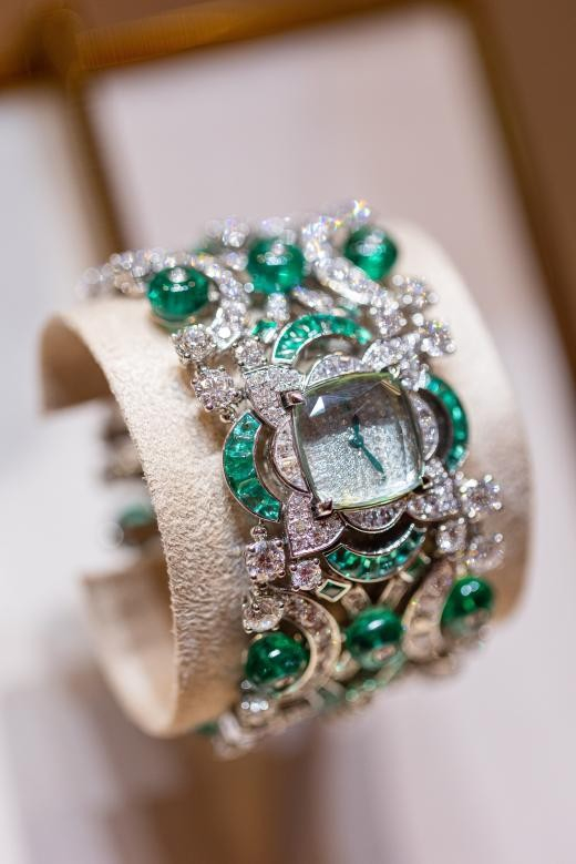 维纳斯魅影(Emerald Venus) 腕表,灵感源于一种名为Capelvenere的地中海蕨类植物,以致敬希腊神话中的美丽女神。这枚计时佳作镶嵌祖母绿,搭配长阶梯型、密镶与圆形明亮式切割钻石,由五名工匠大师耗时900小时制作而成。白色18K金表盘镶嵌薄荷绿碧玺,充分展现了宝格丽对女性优雅气质别致而生动的演绎,带来令人心动不已的特别感受。