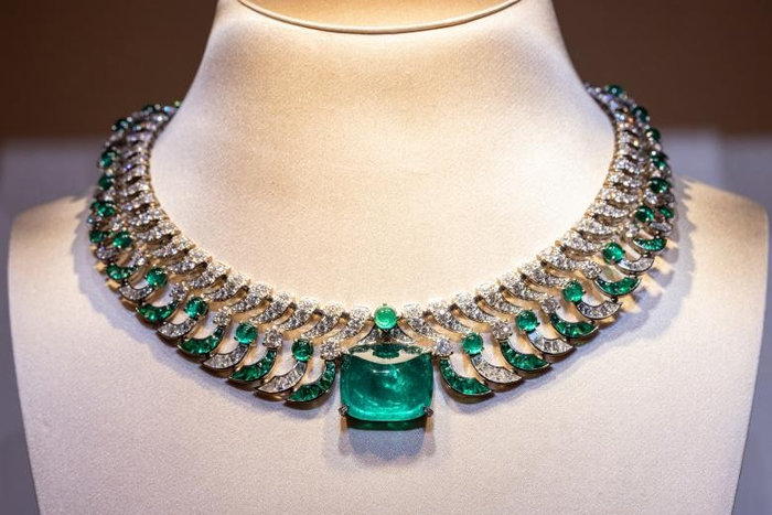 罗马之心(Heart of Rome)项链设计灵感来源于贝佳斯别墅,是矗立“永恒之城”罗马最著名的花园之一,致敬从别墅俯瞰罗马城的浪漫造型。项链中心镶嵌一颗哥伦比亚枕形祖母绿(42.31克拉),完美平衡独特的糖塔切割造型与链条的几何设计,彰显宝格丽大胆精神和宝石精湛切割技艺。