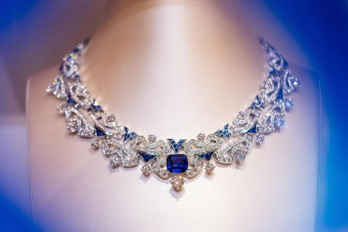 海洋的编织(Ocean Weave) 项链灵感来自于赋予生命的水,呈现大自然塑造万物的力量。整件作品被赋予奇迹:一颗来自斯里兰卡的非凡枕形切割蓝宝石,重达令人惊叹的26.74克拉,让人不由地沉浸于鲜艳的蓝色之中。项链中心被注入罕见的天蓝色调,诠释着宝格丽的色彩绮境,并为中心的蓝宝石镶嵌迷人装饰,打造出壮丽的自然之美,伴随着波浪和水滴造型的珍贵钻石,以优雅和蜿蜒的形式流动,赞叹自然的无穷伟力。