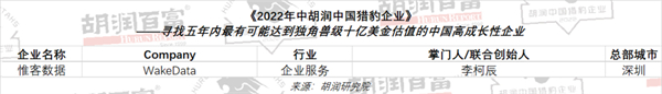 日前,胡润研究院发布“2022年中胡润中国猎豹企业”,列出成立于2000年之后、5年内最有可能达到独角兽级10亿美元估值的中国高成长性企业。WakeData惟客数据凭借自身实力及发展营收成功上榜。