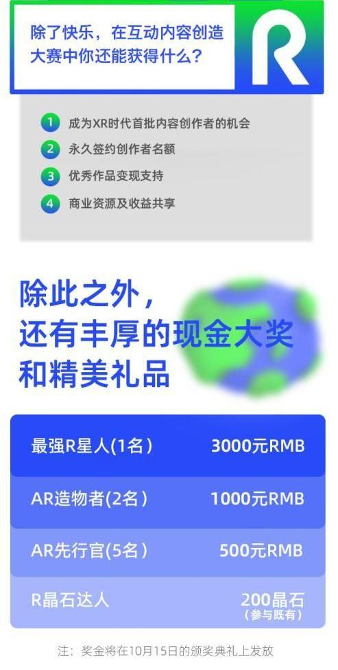 为推动AR游戏普及,让更多用户参与XR内容创作中,此次互动内容创作大赛——“R星人宇宙”赛场设置了超丰厚的赛事奖励。一方面,参赛者不仅有机会获得超丰厚的现金奖励,还将有机会成为XR时代首批内容创作者,并永久签约创作者名额。此外,玩家优秀的创作作品还将获得变现支持,与主办方一起共享商业资源和收益。(具体权益信息请参照Mirror space官网)