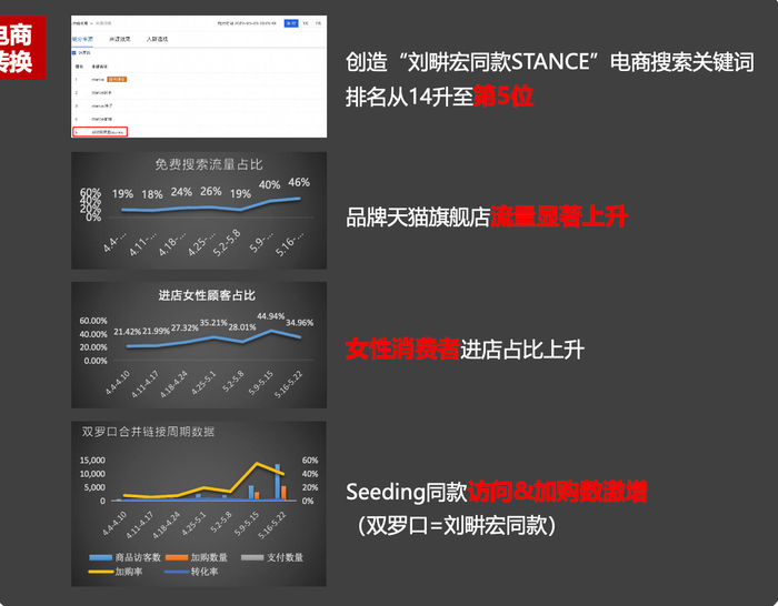 由此在站内炒热刘畊宏同款STANCE,吸引众多UGC用户跟风种草。深入互动式种草,强化STANCE 品牌形象与刘畊宏强绑定,打造值得信赖的品牌形象,更多用户跟风入手,引导用户进行站内外购买转化。