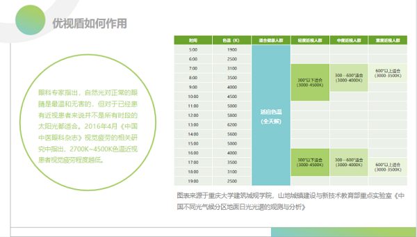 定制化: 根据太阳一天色温曲线,优视盾模拟出三个时间段的太阳色温,分别适合300°以下轻度近视人群、300°~600°中度近视人群以及600°以上高度近视人群。在无蓝光、无频闪、无炫光、高显色等技术保障之上,分别选取适合不同近视程度人群的自然光色温,让眼睛在这种无限接近自然光的健康光源环境中保持最舒适放松的状态,不会产生自然的眼疲劳,从而达到温、润、养、护的效果。