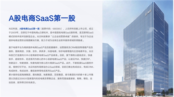 光云科技成立于2009年,已打造面向大中小型商家的电商SaaS产品体系。其中重点合作的深绘是针对电商商品数字化解决方案的系统,通过深绘帮助品牌商达成从生产环节到可售环节的商品素材制作、发布智能化,满足多平台上货的需求,大幅度提升电商企业上新效率,并显著降低运营成本。