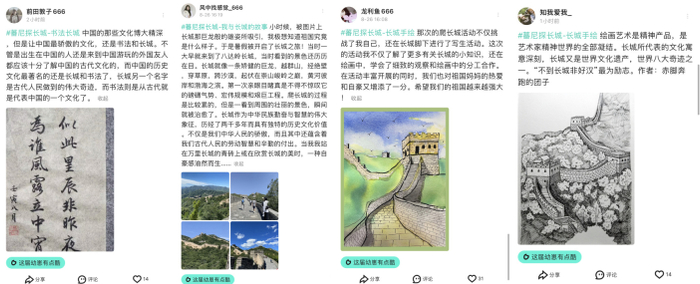 《蕃尼探长城》的播出受到了各界的好评,中国长城学会副会长董耀会高度肯定了《蕃尼看世界》对传承长城文化做出的探索和努力:“长城文化与精神的传承,需要大众尤其是青少年的加入,让古老的长城在新时代发挥新的价值。”这份对长城的热忱,也点燃了优酷社区网友们的热情,纷纷用手绘、书法、打卡故事等表达自己的长城情怀。有网友这样说道:“长城作为一座历史的实物丰碑,将在中华大地上永立不倒”。