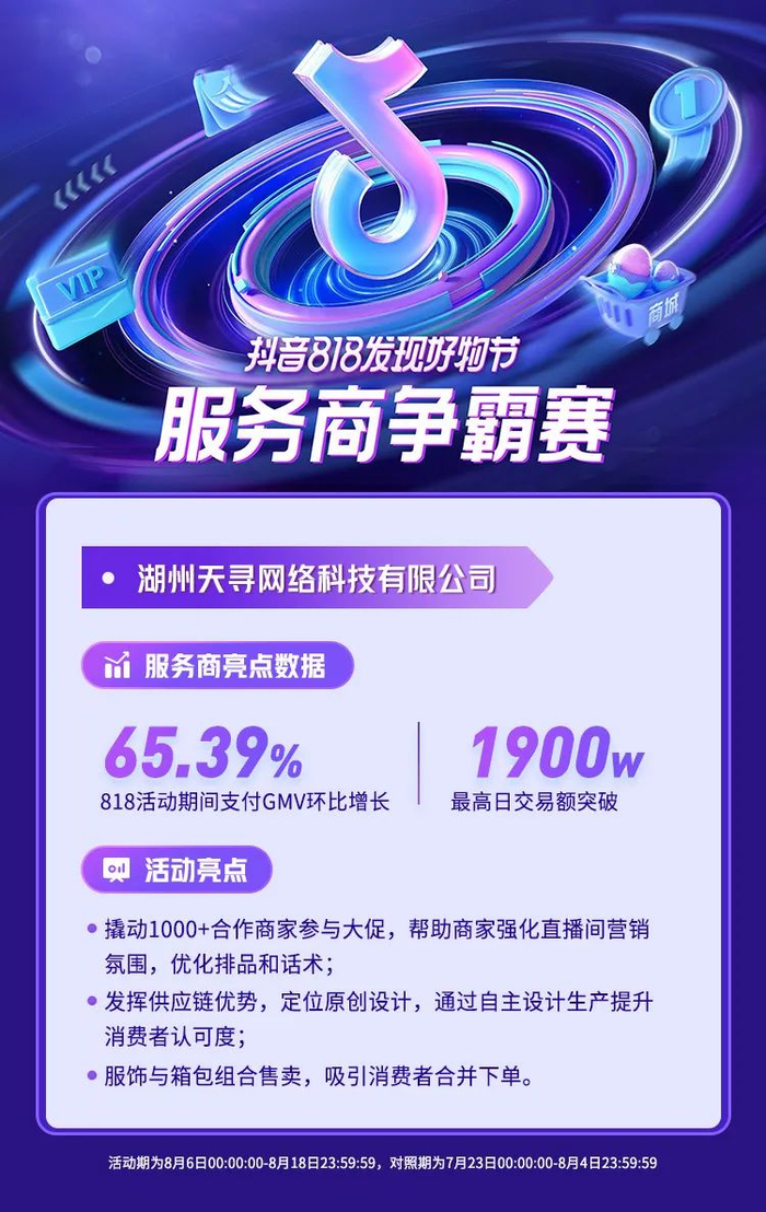 在日常经营和818大促期间,抖音电商平台推出了形式多样的扶持政策、流量补贴;推出服务商任务赛、服务商排位赛等平台活动,鼓励服务商参加,提升经营能力;抖音电商平台还推出各种各样的专项活动,让产业带服务商有更多的抓手,去扶持商家,实现销量增长。