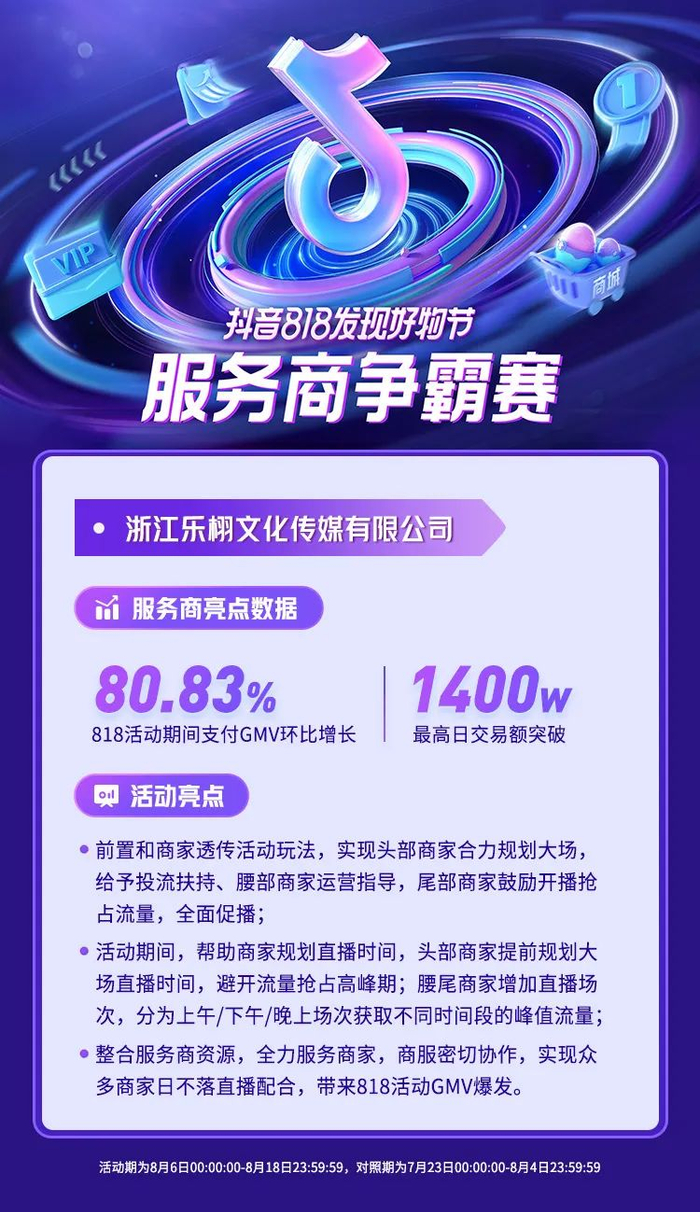 818期间,乐栩发挥自身流量代投的优势,配合抖音电商平台的活动,帮助商家日不落直播做短期爆发增量,并提前和商家计划好大场直播时间,避开818开播高峰期抢占流量。活动期间,乐栩服务的商家GMV环比增长73%,是7月同期峰值的两倍。