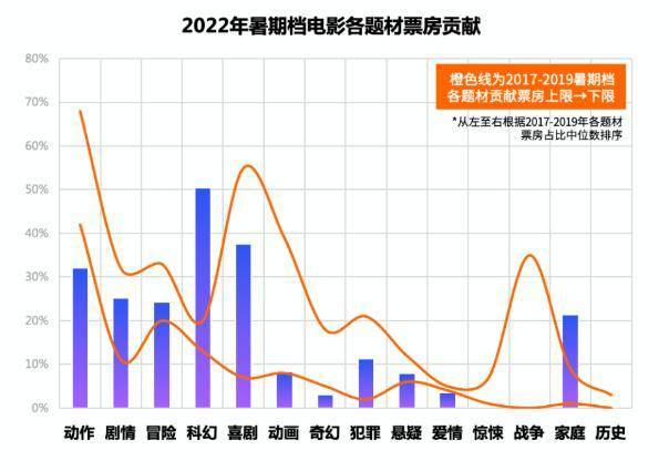 从上映的影片题材来看,由于疫情对行业上游生产创作的影响,自2020年以来,市场各类影片的供给持续处于不稳定状态,尤其影响到了成本较高的动作、奇幻、冒险等题材,也不乏市场高频需求的喜剧、动画等类型。2022年暑期档票房前五名涉及八种题材,各品类票房在大盘的占比趋向均衡。这种突破题材局限,通过对头部影片的类型进行搭配,以科幻大片打开市场,上映动作、喜剧、悬疑各类型影片的方式,满足了观众对于主流题材的观影需求。