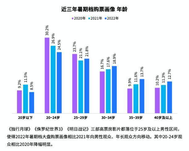 从观影人群的角度来看,《独行月球》、《侏罗纪世界3》、《明日战记》三部高票房影片都落位于25岁及以上男性区间,使得2022年暑期大盘购票画像相比2021年向男性观众、年长观众方向移动。对比之下,20-24岁观众占比相比2020年降幅明显。