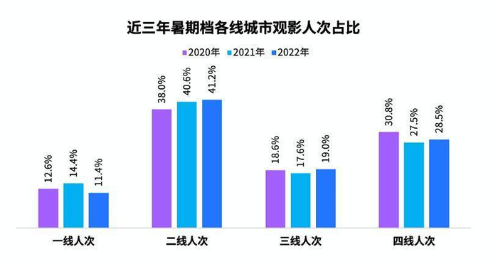 数据显示,由于2022年暑期档期间全国疫情得到有效控制,使得地区分周复工率保持在82%—89%这一相对稳定的区间内,与历史同期相比,三四线城市观影人次占比优于2021年,呈复苏态势。