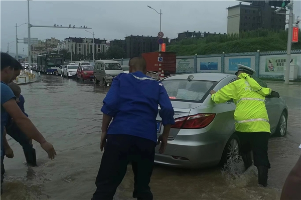 兴隆一路海岸路桥洞子是个水窝子,暴雨积水至两辆车抛锚水中。雨越下越大,水越积越深,巡逻至此的交警疏导车辆蹚水 走进桥底,与其他热心群众一起将两辆抛锚车辆推出,一句“感谢”,是人民群众对交警最大认可。