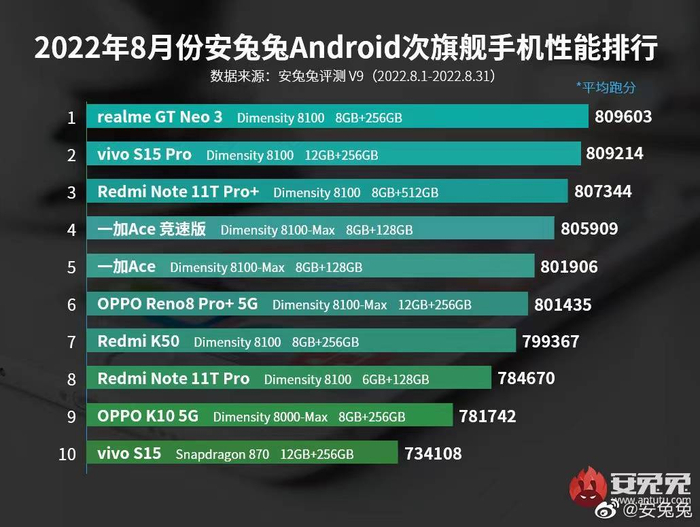 安兔兔8月安卓次旗舰手机性能榜出炉,天玑8000系列连续四个月屠榜