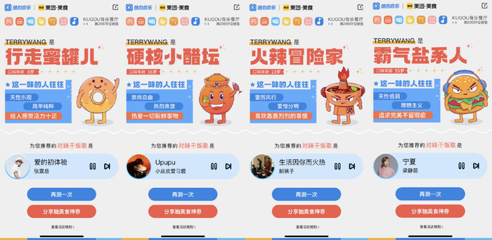 在酷狗音乐的这支“测测你是哪一味”的H5中,KUGOU音乐餐厅“开业”了。用户可以在KUGOU音乐餐厅丰富多样的菜单中,选择最符合自己味蕾的美食,在酷狗大数据的支持下,可以得到一张关于用户“口味”年龄的海报,并且匹配出“对味干饭歌”。从私人订制的个性别称、MBTI、到干饭曲目,创意满满,参与测试还有机会获得来自美团商家的美食优惠券。