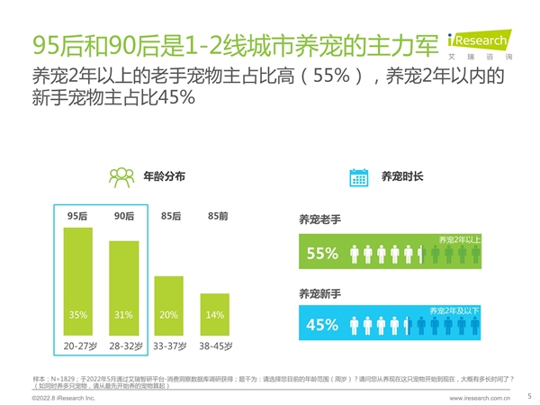 据《宠物保健品消费态度洞察白皮书》显示,95后和90后已经成为1-2线城市养宠的主力军,其中95后占比高达35%,城市中的养宠人群呈现年轻化趋势。同时,近两年养宠人数快速提升,养宠新手(养宠2年及以下)占比45%。